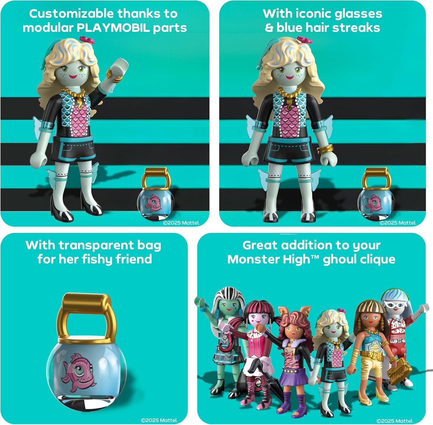 Make a splash with Lagoona Blue! This sea-loving ghoul glows with ocean-inspired details and arrives with a translucent bag carrying her fishy friend in PLAYMOBIL style. A deep-sea dream for collectors looking to bring some underwater magic to their Monster High display.